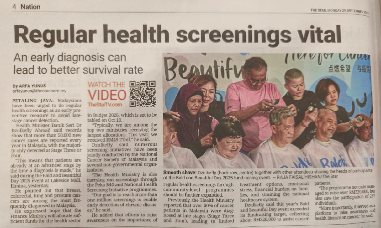 Cancer diagnoses remain a major challenge in Malaysia with over 50,000 new cancer cases reported annually, where more than 60% are detected late. Regular health screenings are vital to catch cancer early when treatment outcomes are significantly better. Bald & Beautiful not only raises funds but also promotes greater understanding of preventive health practices.